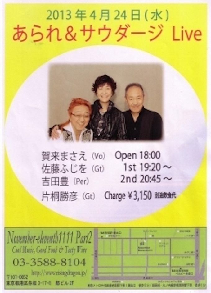 Open11:30~、Live(1st)12:30~、(2nd)13:30~ チケット¥1,500(要、1ドリンク、1フードの注文)