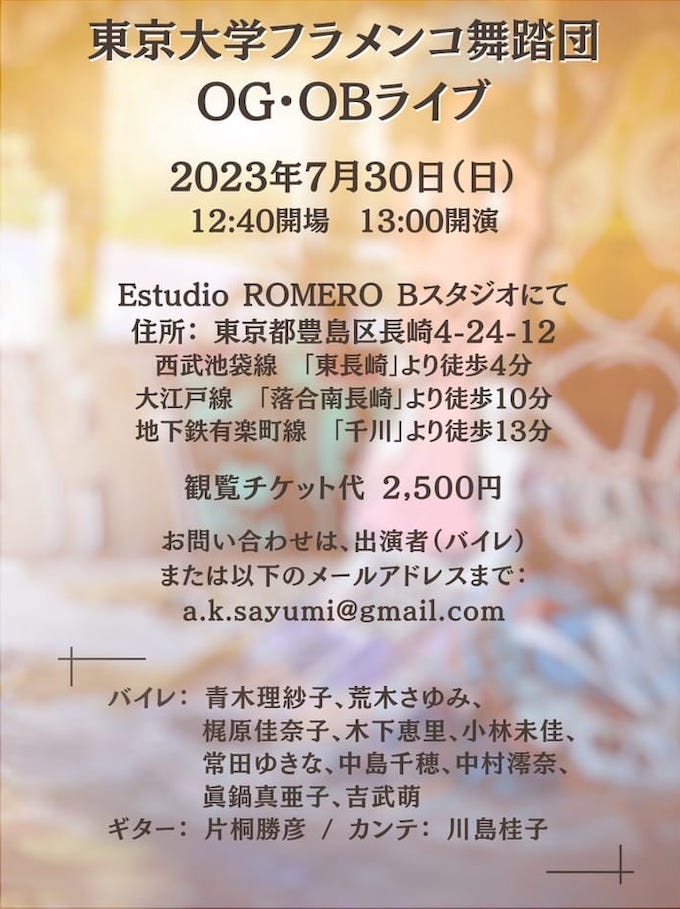 荒濱早絵、川松冬花、久保田晴菜、JURINA、中里眞央、中原潤、山﨑嬉星、脇川愛、全国学生フラメンコ連盟、他