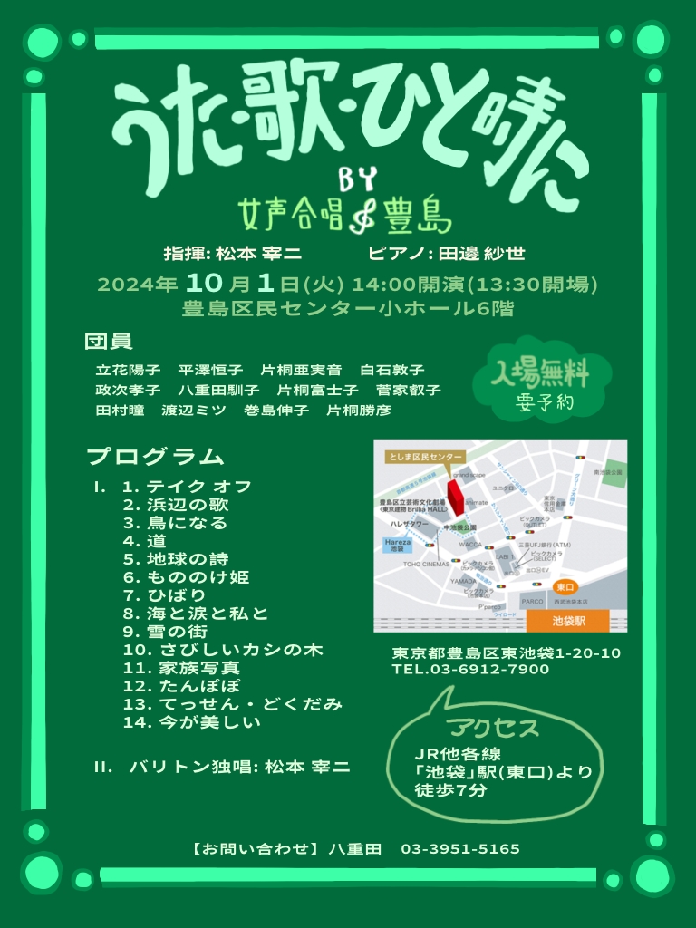 ■10月1日(火)池袋「豊島区民センター小ホール(うた・歌・ひと時に)」