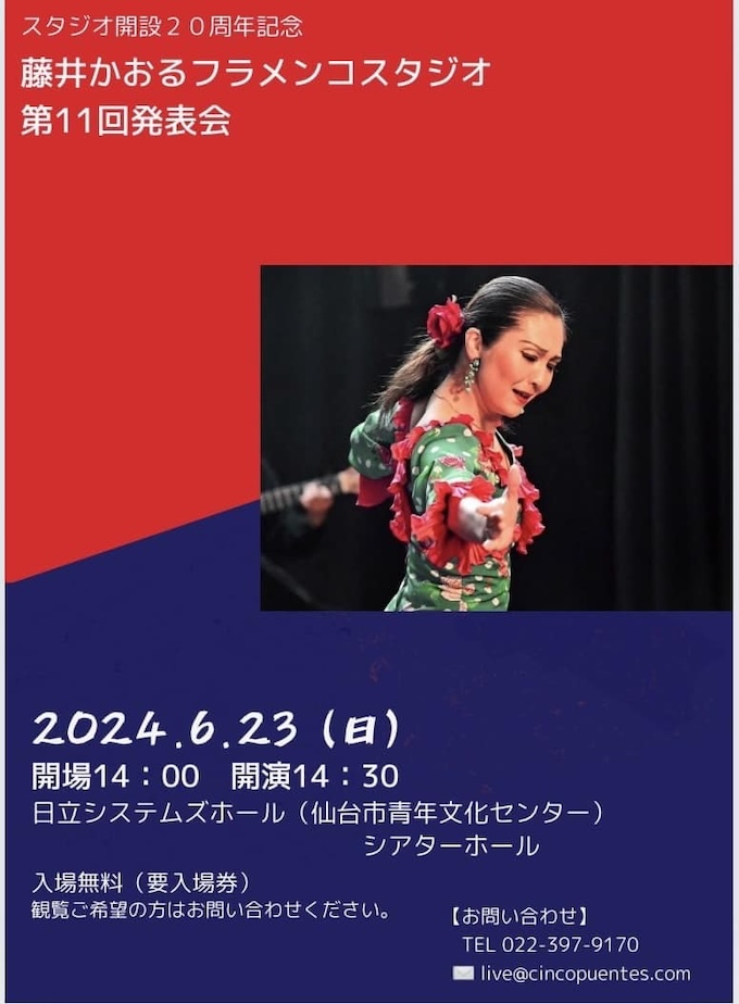 ■6月23日(日)宮城県・仙台「日立システムズホール(藤井かおるフラメンコスタジオ第11回発表会)」