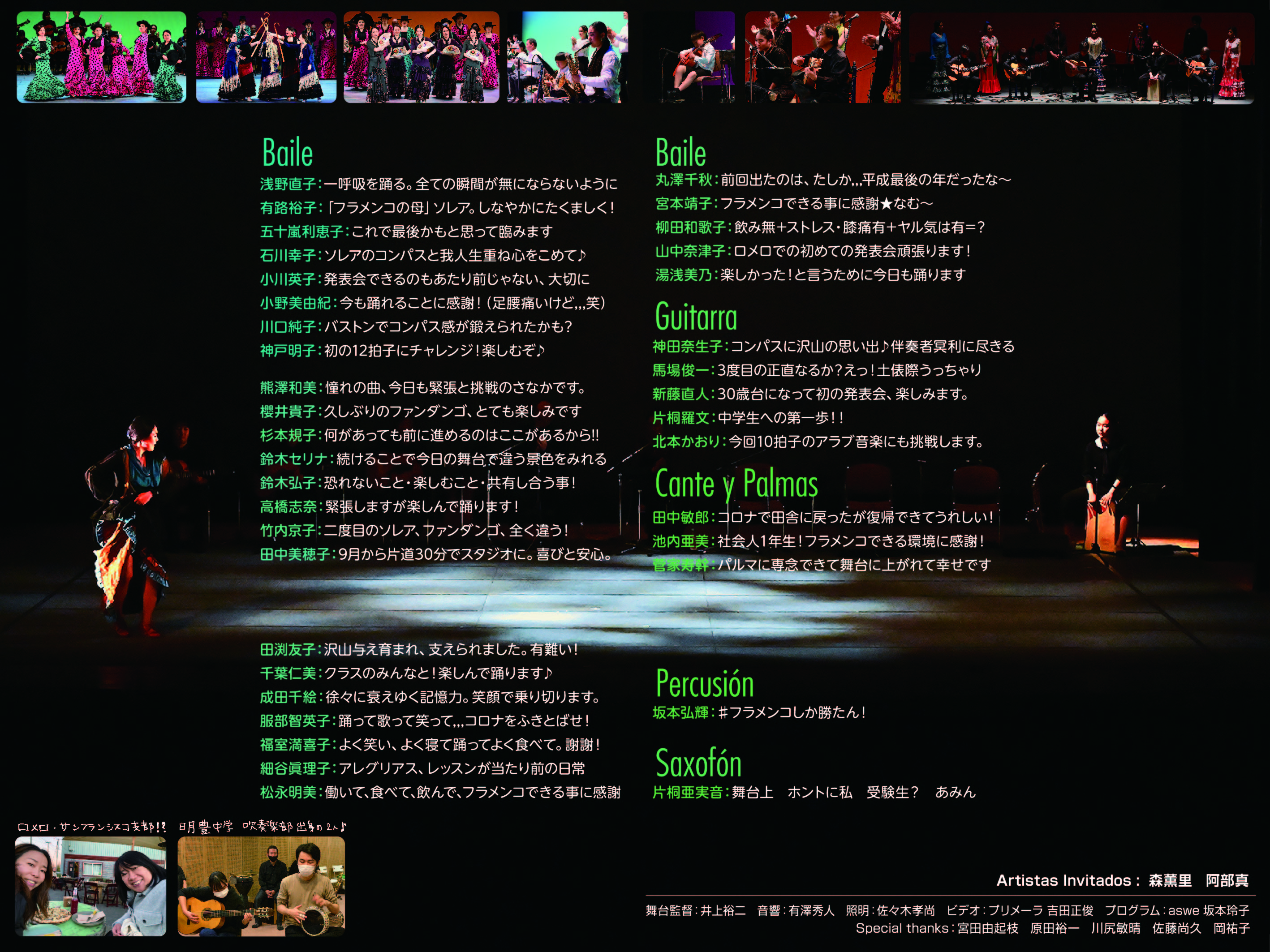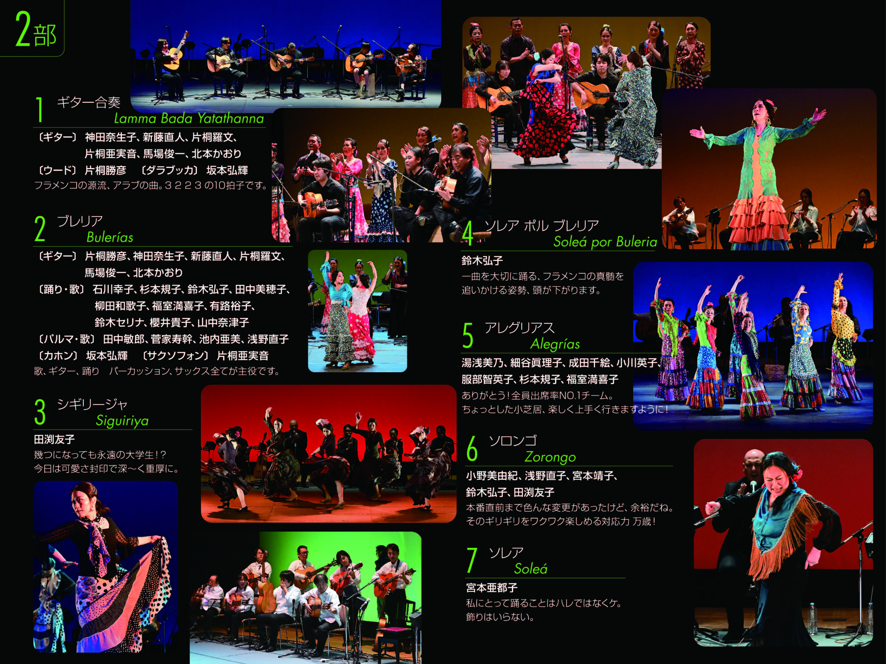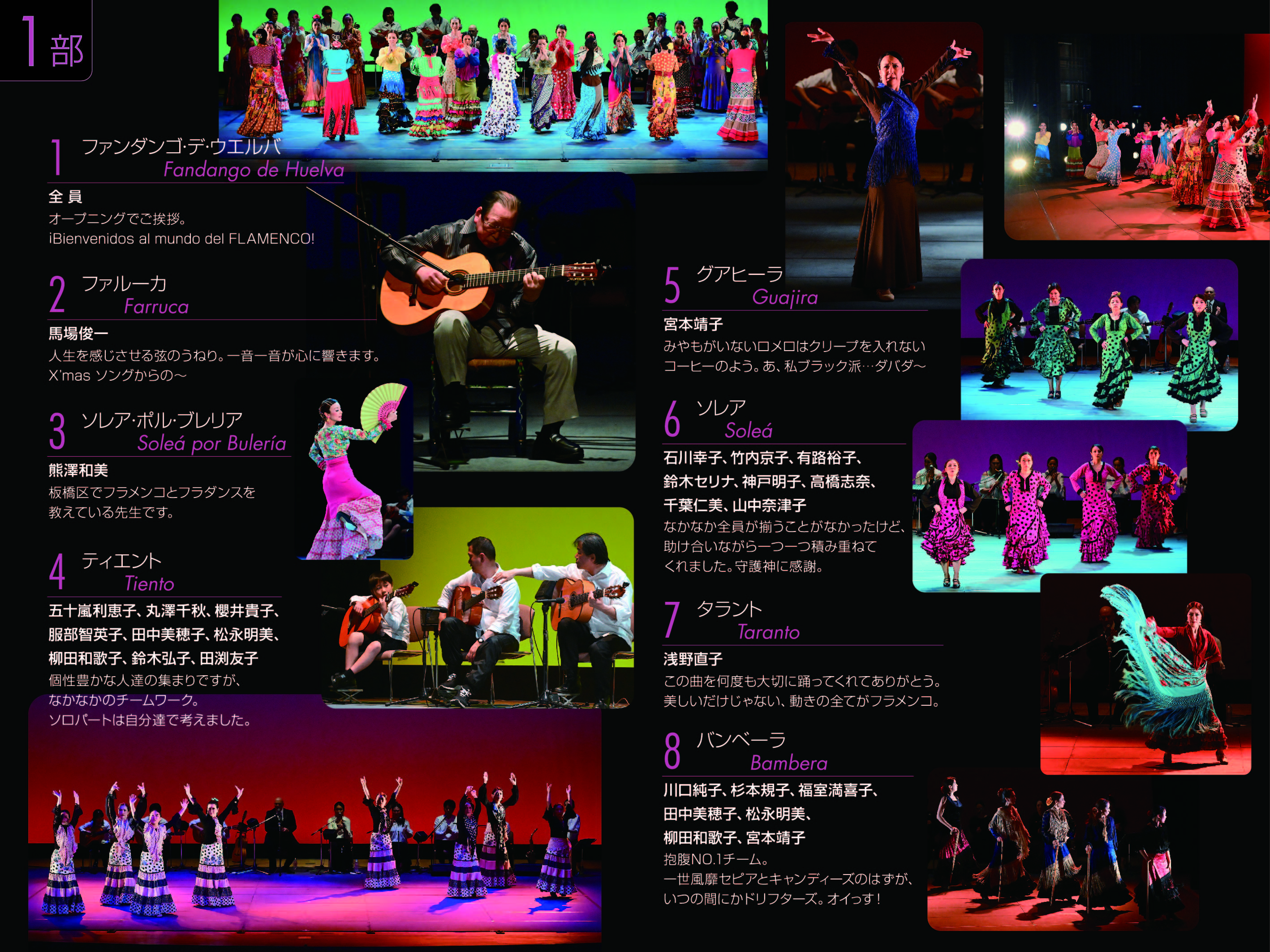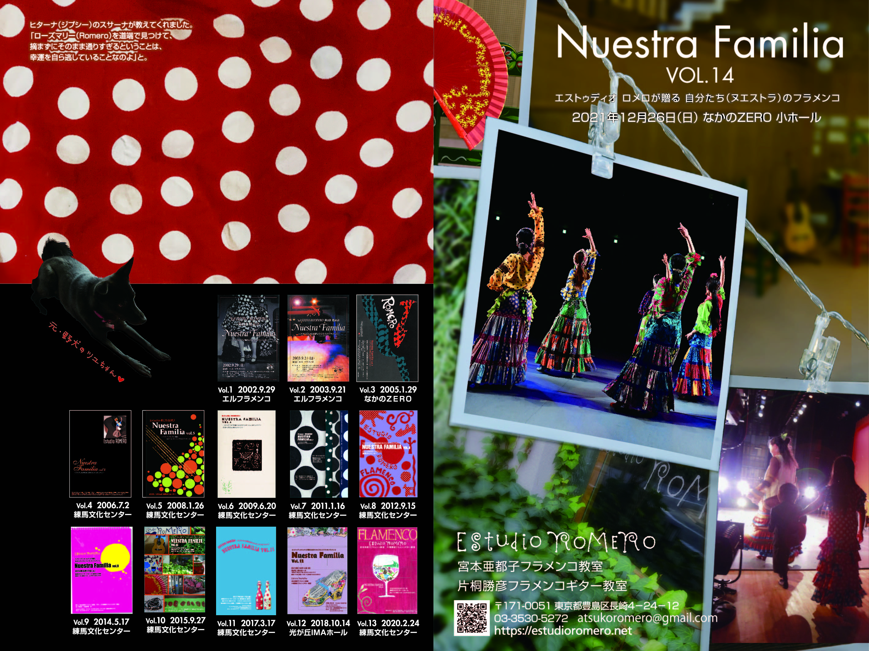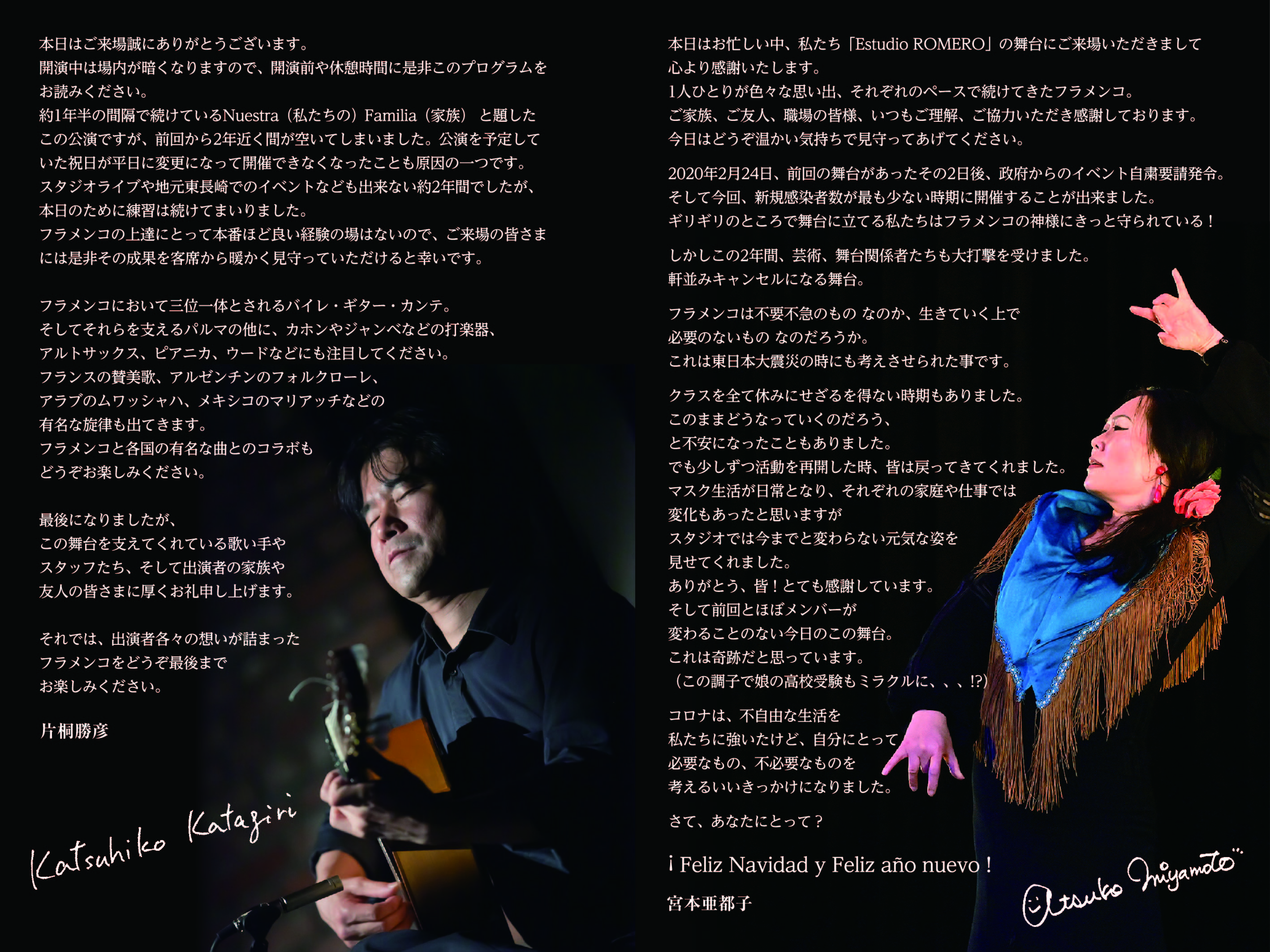Nuestra Familia 14 プログラム 明けましておめでとうございます。 先月12/26に、発表公演を無事に終えることができました。 お越しいただいた方々、誠にありがとうございました。 今月(1月)からの踊りのクラスは、足慣らしやテクニカ中心の内容で、メンバーや曲を決めていきます。 見学や体験レッスン希望の方は、このクラス編成の期間に是非お越しください! Nuestra Familia vol,14 プログラム